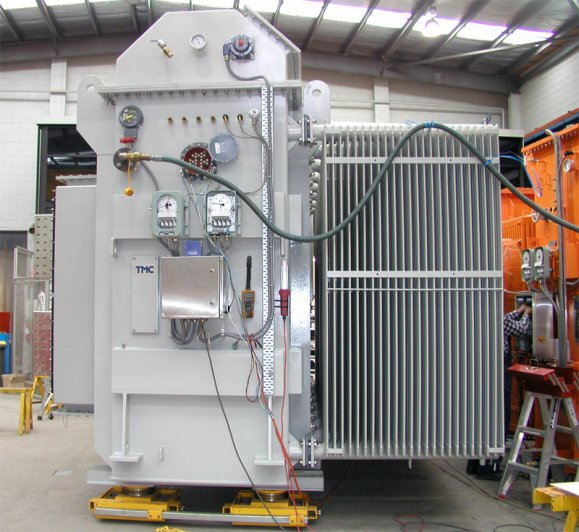 TMC oil cooled transformers can be supplied with fans and pumps to increase the rated capacity (kVA). Forced directed oil circulation and/or forced air cooling of radiators permits a continuous power increase of up to 25% above the rated capacity. Fans can be used to economically provide extra capacity for overload conditions such as cyclic load peaks and traction loads.